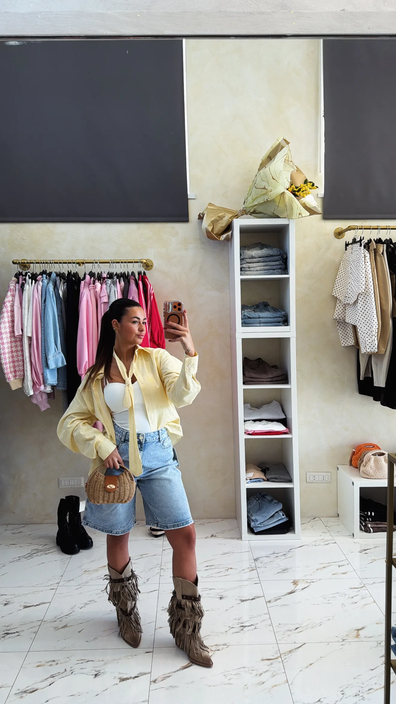 Camicia gialla con maniche a palloncino con cravatta