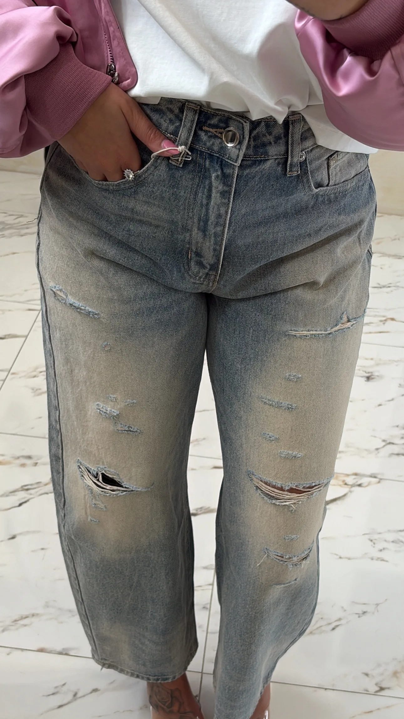 Jeans dal lavaggio chiaro effetto vissuto con strappi dal look deciso. Vestibilità comoda e stile urban perfetto per ogni giorno.