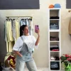 Pantalone del tailleur Lumina. Coordinato di raso celestino composto con giacca e pantalone zampa.